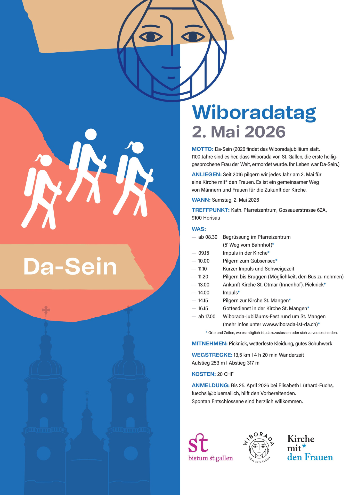 Herzliche Einladung zum Wiboradatag am Samstag, 2. Mai 2026, dem Pilgertag und dem Wegzeichen für Gleichberechtigung in der Kirche. Wir beginnen den Tag im Pfarreizentrum Herisau und spazieren vorbei am Gübsensee durch Bruggen und St. Otmar zur Kirche St. Mangen in St.Gallen.